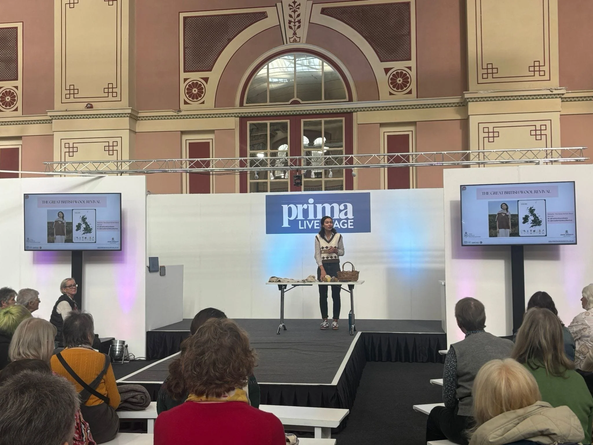 I finally arrived at the Prima (the magazine) stage, where I was scheduled to go on at 2.15pm, with my talk ‘British Wool: Farmer to Designer with Harriet Fletcher-Gilhuys’. The stage was completely packed, filled with inquisitive knitters and crafters, interested in learning about fibre provenance, heritage crafts, fibre sovereignty and local production in the modern day.