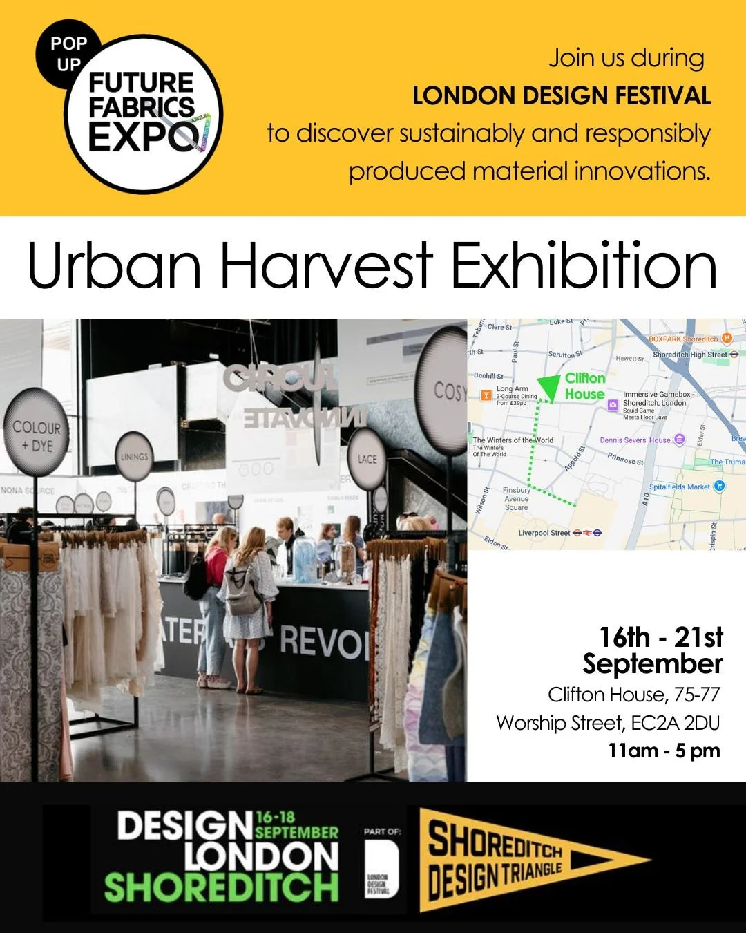 In collaboration with the Shoreditch Design Triangle, Crafts Council, The Sustainable Angle, RAEBURN, Katy Mason Studio, Cassie Quinn, Brodie Neill, Ella Doran x Well Crafted, Open Desk, British Pasture Leather, Green Lab, Travel Things Museum, Daniel Heath Studio and ING Media.