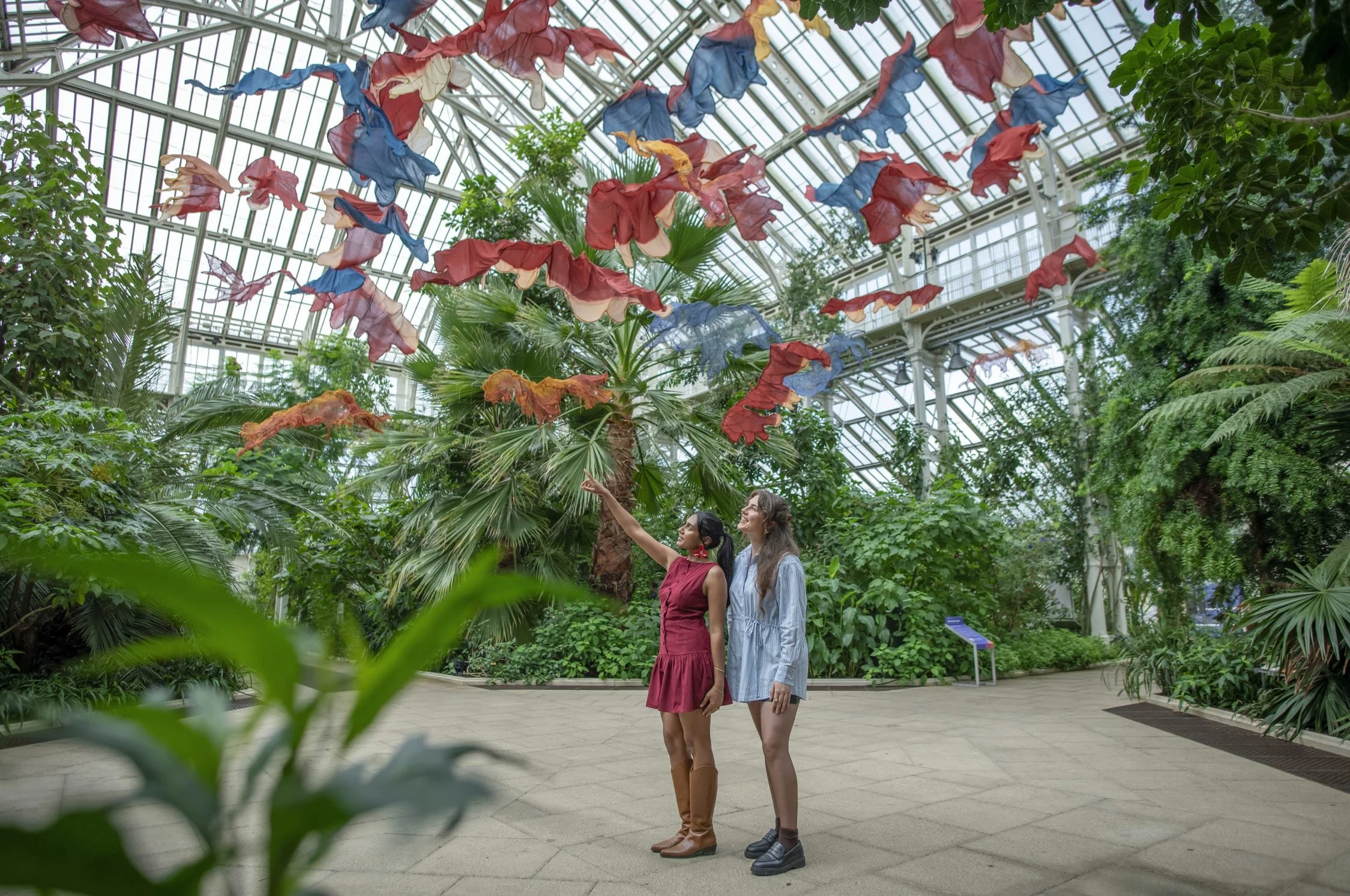 After being greeted by the friendly Kew team, I was led down a central walk-way within the iconic glass structure surrounded by unique plants, flowers and the sounds of nature. As I looked overhead, I saw a variety of winged forms floating and swaying in the high ceiling. Each unique form is made out of organic cotton, hessian and cheesecloth all dyed using a combination of madder, indigo, logwood and marigold natural dyes.