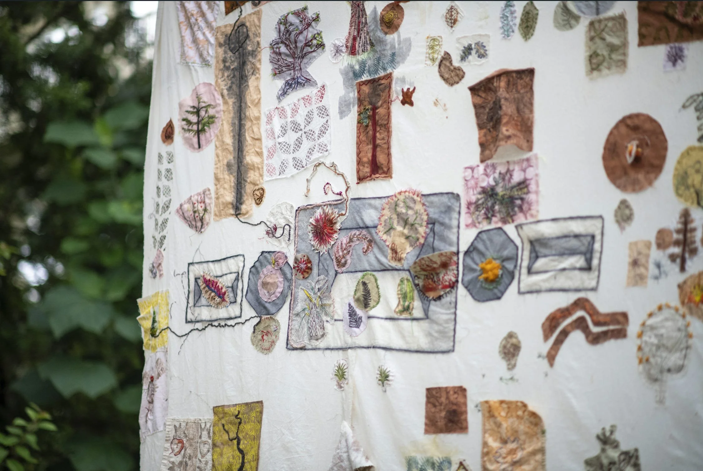 The botanically dyed piece, which sways gently in the wind, consists of naturally dyed embroidered threads, tree-based inks and hand-carved blocks for printing to celebrate Kew’s remarkable trees and its natural connection to dyes found in nature.